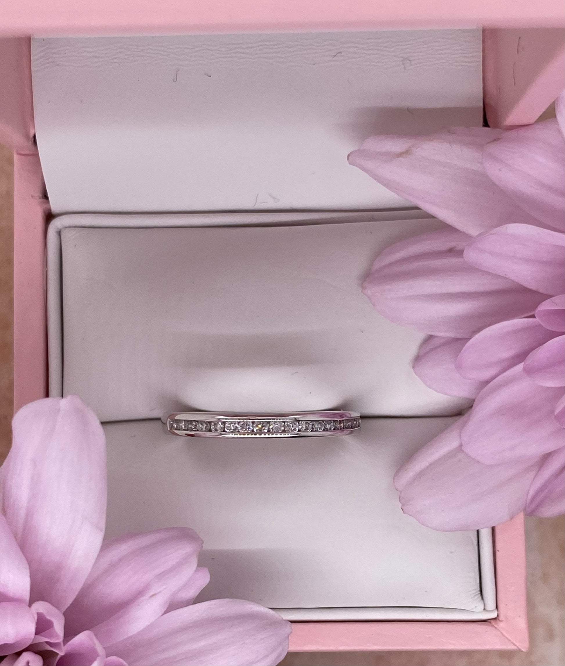 Crafted in 18 carat white gold, this 2.30 mm wide band is channel set with 20 round brilliant cut white diamonds, totalling 0.19 carats, colour F, Clarity VS.