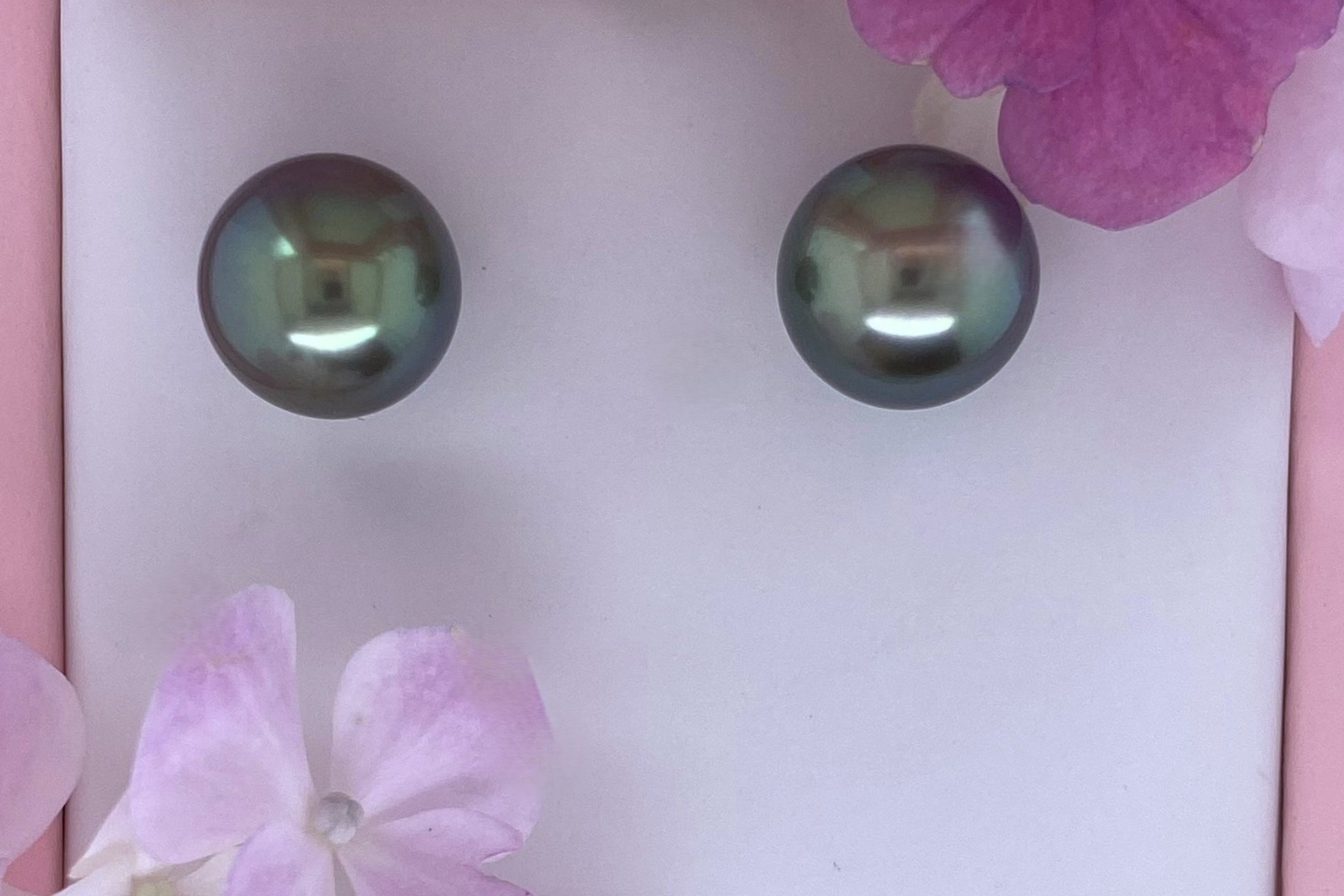 One pair of pearl earrings. The natural cultivated Tahitian black pearls, round shape, with greenish over tone, exhibiting strong lustre and clean skin (10.00 - 10.50 mm). The earrings are fitted with 18 carat white gold posts and butterfly clips.