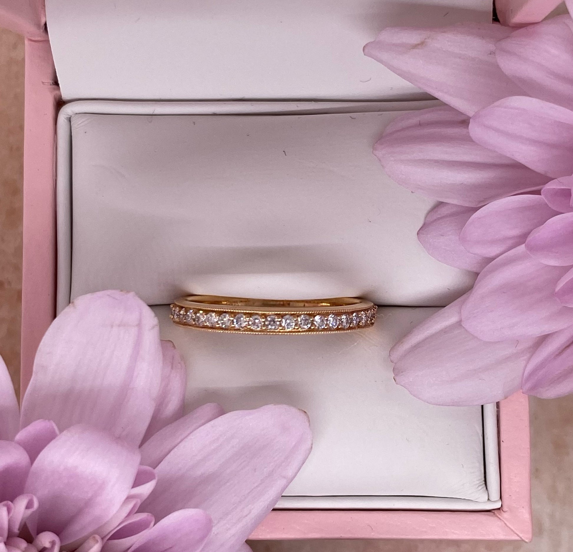 Crafted in 18 carat rose gold, this 2.50 mm band is bead set with 23 round brilliant cut white diamonds, totalling 0.23 carats, colour F, Clarity VS.