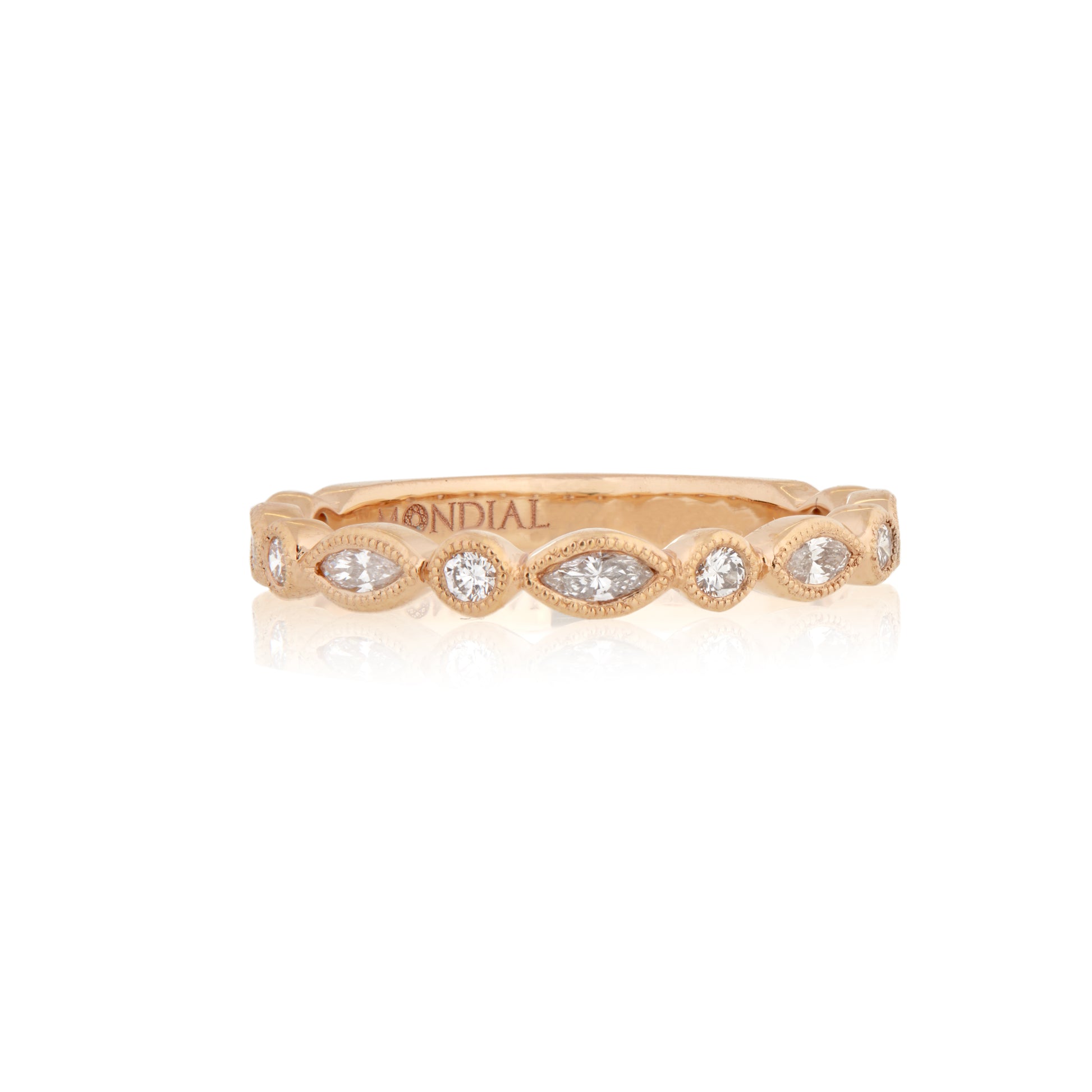 Crafted in 18 carat rose gold, this Leaf & Berry ring is bezel set and millegrain edge with 5 marquise cut diamonds (5=0.20 carats) and 6 round brilliant cut diamonds (6=0.13 carats), colour F, clarity VS. Approximately 2.5 mm wide.