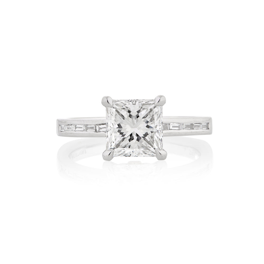 Crafted in 18 carat white gold, the ring features one GIA certified princess cut diamond, weighing 2.30 carats, colour F, clarity VS1 with 'excellent' polish and symmetry (cert: 16855304, laser inscribed). The shank is channel set on each side with 5 baguette cut diamonds (10=0.15 carats), colour F, clarity VS. The main setting features a single round brilliant cut diamond (2=0.01cts), colour 4P, bezel set in rose gold, on each side of the profile.