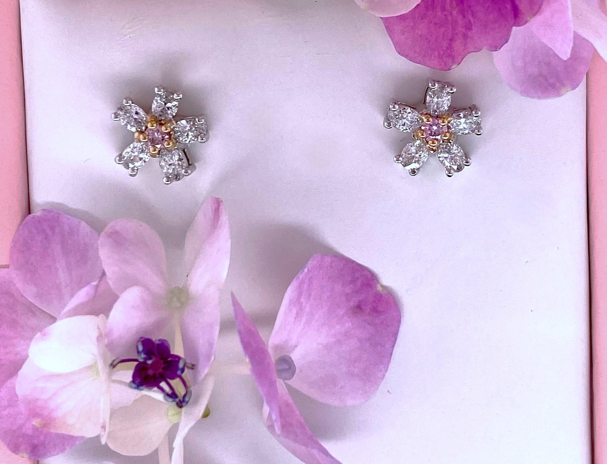 Crafted in 18 carat white and rose gold, each earring is set with one round brilliant cut Argyle pink diamond, total weight: 2 = 0.08 carats, colour 5P with Argyle lot number and surrounded by oval shape white diamonds, total weight: 10 = 0.55 carats, colour F, clarity VS. The earrings are fitted with 18 carat white gold posts and butterfly clips.